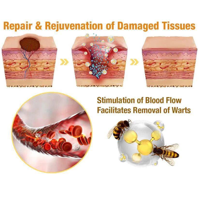 Another significant advantage of bee venom is its ability to enhance blood circulation. It can stimulates blood flow in the treated area, facilitating the removal of skin tags or warts by promoting tissue regeneration and accelerating the healing process, aiding in the repair and rejuvenation of damaged tissues.